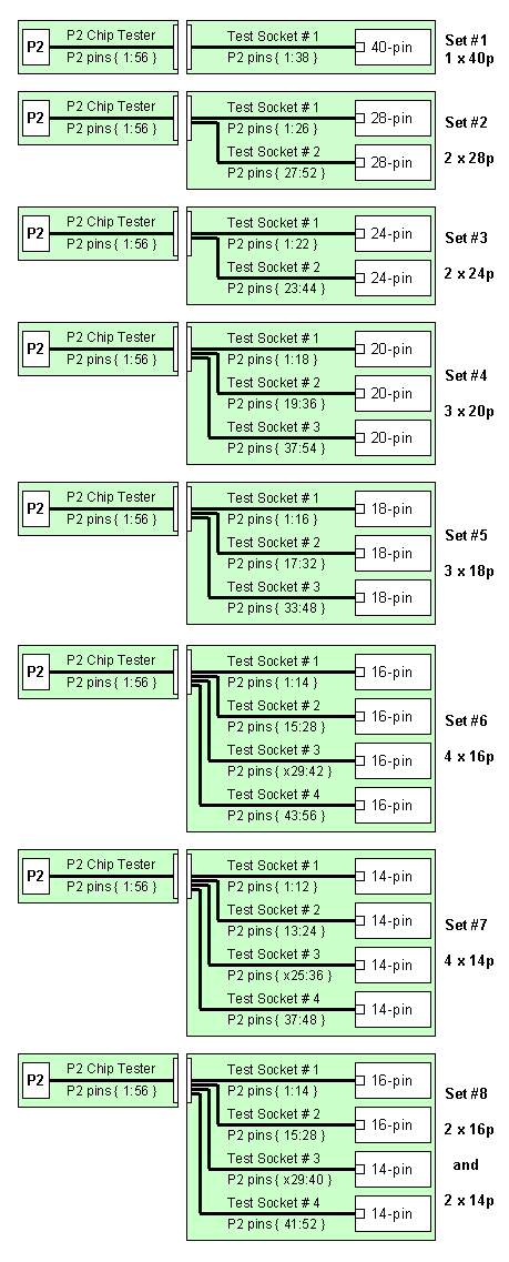 The diagram below illustrates some examples of modular test socket boards that could connect to the P2 chip tester board and use its estimated 56 I/O pins to connect to its test sockets. Notice that no P2 I/O pin is shared with any other test socket pin.